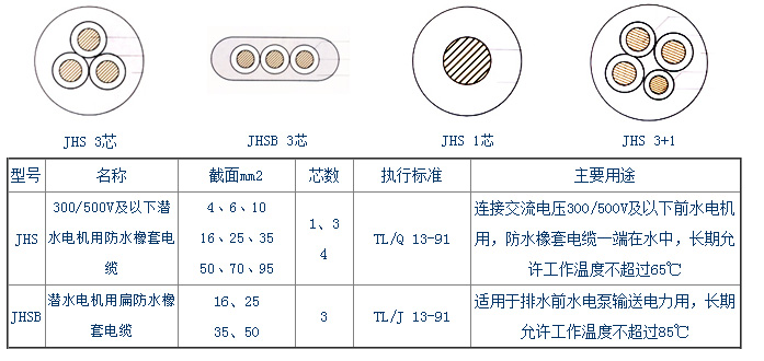 JHS防水電纜/JHSB防水扁電纜線為水下潛水泵用防水線,本橡套電纜線采用防水外護套制成。JHS型防水橡套電纜供交流電壓500V及以下的潛水電機上傳輸電能用。在長期浸水及較大的水壓下,具有良好的電氣絕緣性能。防水橡套電纜彎曲性能良好,能承受經(jīng)常的移動.