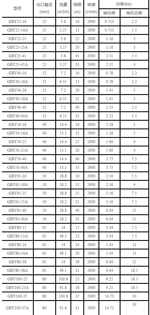 GBY濃硫酸液下泵性能參數(shù)表