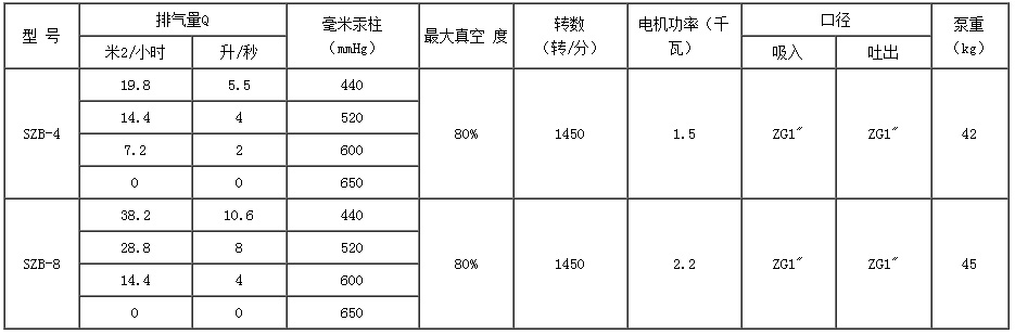 SZB水環(huán)式真空泵目前制造的本型號(hào)泵有:SZB-4、 SZB-8。其中4(8)表示當(dāng)水銀柱高為520毫米時(shí)的氣量(升/秒)。