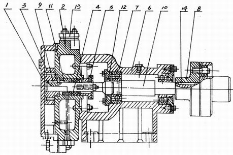 8. 聯(lián)軸器 9.葉輪平健 10.泵軸 11.填料環(huán) 12.軸承壓蓋 13.法蘭盤 14.聯(lián)軸器平健